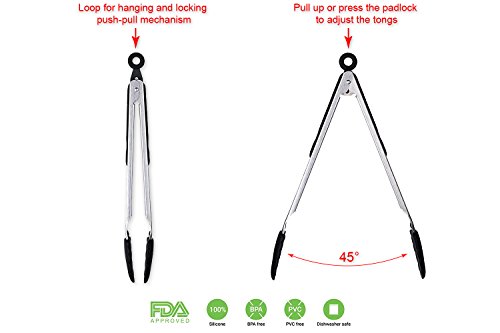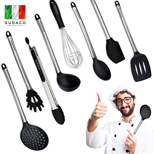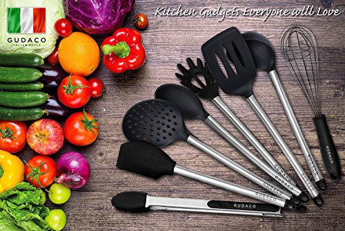 -. Title : Christmas Gift 2017 Gudaco Premium Kitchen Utensils Italian Style 8 Piece Black Silicone Stainless Steel Kit: Serving Tongs, Spoon, Spatula Tools, Pasta Server, Ladle, Strainer, Whisk for Pots, Pans