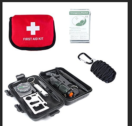 - OVER-ALL QUALITY: Airtight and plastic case of Multi-functional Survival kit encases heavy-duty, quality-controlled and well-inspected tools inside. The fishing kit comes handy inside the durable paracord if food for survival is at risk. Added to this is the First-aid kit, carefully chosen with basic essentials whose dimension is small enough, perfect combo with the survival kit to easily fit a backpack or at the car. We also offer our one-year warranty to every kit purchased.