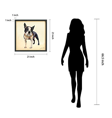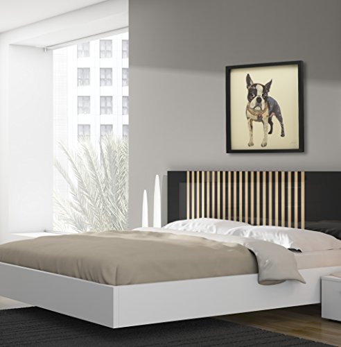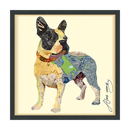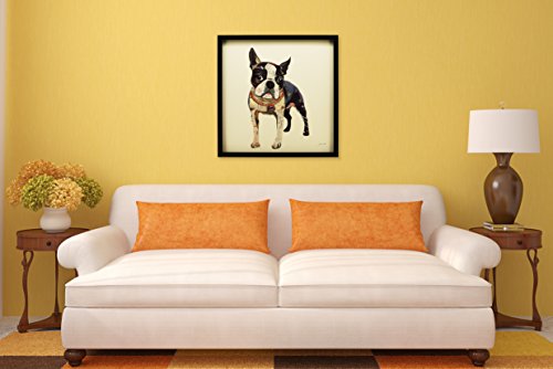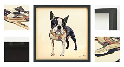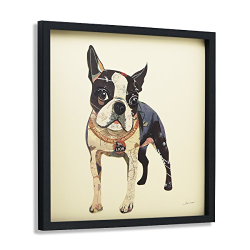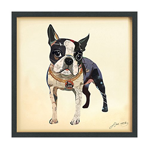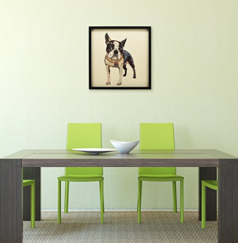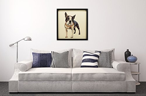 This collage depicting a Boston Terrier is a fine example of how a two-dimensional image can take on three-dimensional depth. The dog’s hindquarters are simply represented by dark shapes, with the pink underbelly, yet juxtaposed against the white forelegs it creates a very real perception of depth. This is a fine backdrop for the eager face with big, round eyes, suggesting that this excitable dog is ready to bound forwards.Feature