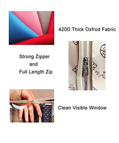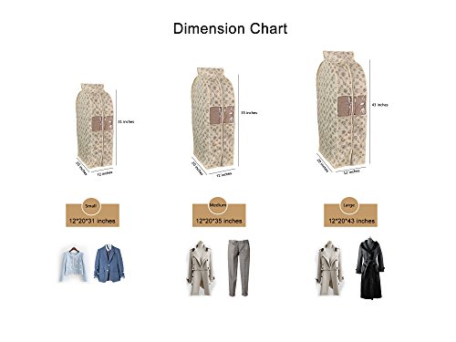 -. Feature : S size:12*20*31 inches,M size:12*20*35 inches,L size:12*20*43 inches. / Material is 420D Oxford Fabric,breathable and acid free for long term storage. / Strong zipper and full length zip. The visible window easy to find clothes. / Ideal length for suits, shirts, trousers, tops, sport coats etc / Could be washing,folding and reused for a long time.
