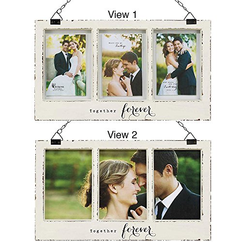 -. Binding : Kitchen -. Brand : Dicksons -. EAN : 0603799523158 -. Feature : Unique wedding wall photo frame offers you two options: You can display 3 separate 5" x 7" photos, or one photo approximately 16" wide x 7 1/2" high that will continue through all three windows / Overall frame size is 17 1/2" wide x 10" high, plus silver metal hanging chain / Caption at bottom is "Together forever" / Made of wood; distress finish at edges adds vintage charm / Metal hanging chain -. IsAutographed : 0 -. Label : Dicksons -. Manufacturer : Dicksons -. MPN : WPFF-10 -. PartNumber : WPFF-10 -. ProductGroup : Home -. ProductTypeName : HOME -. Publisher : Dicksons -. Studio : Dicksons -. Title : Wedding Window Pane Floater Wall Photo Frame - Together Forever -. UPC : 603799523158
