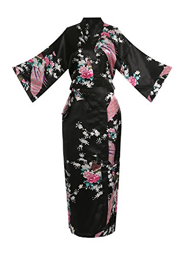 Women's Kimono Long Robe - Peacock & Blossoms Long Kimono Robe(Medium,Black)