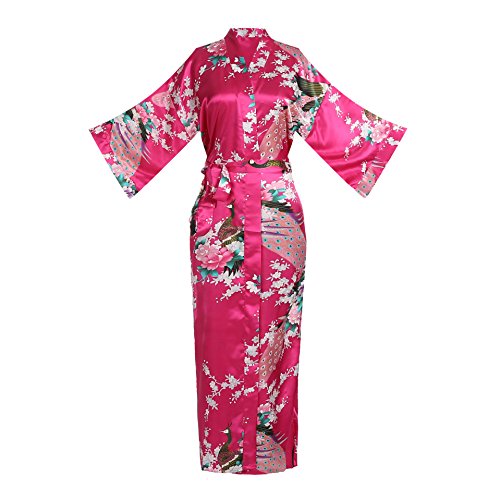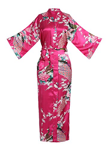 Women's Kimono Long Robe - Peacock & Blossoms Long Kimono Robe(Medium,Fuchsia)