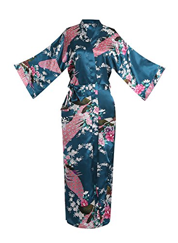Women's Kimono Long Robe - Peacock & Blossoms Long Kimono Robe(Medium,Teal)