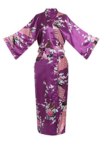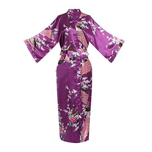 Women's Kimono Long Robe - Peacock & Blossoms Long Kimono Robe(X-Large,Purple)