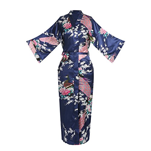 Women's Kimono Long Robe - Peacock & Blossoms Long Kimono Robe(Medium,Navy)