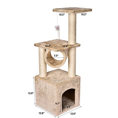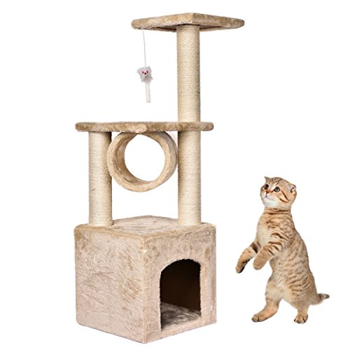 LULUXI 36" deluxe cat tree playground covered with soft plush, provide kittens with a place to have fun. This cat tree features two perches, one condo, one tunnel and a toy mice. It has plenty of room for your cats to play and lounge. With 3 posts covered in sisal rope to scratch on, kittens will enjoy the cat tree and leave alone with your expensive furniture .