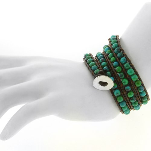 - Title : 21" Blue/Green Beads on Dark Brown Leather Wrap Bracelet with Snap Button Lock