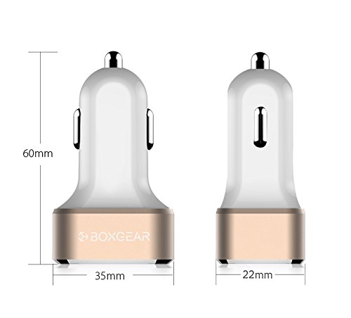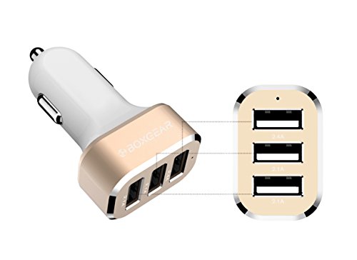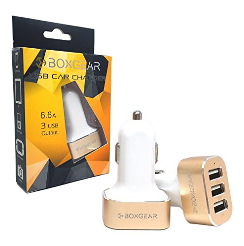 3 USB Port Car Charger, Boxgear {6.6A} Rapid Charger Tri-Port USB Fast Charger for iPhone, Samsung Galaxy, HTC One, iPad, iPod, And All Other USB Plugs - White/Gold