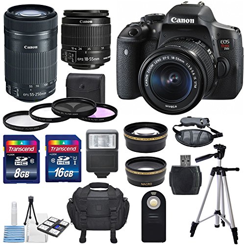 -. Feature : For gorgeous, high-quality photos and videos take a look at the Canon EOS Rebel T6i DSLR Camera, that has a high resolution 24.2-megapixel CMOS sensor and the DIGIC 6 Image Processor for exceptionally clear, vivid and sharp pictures and striking results. / This Canon EOS rebel T6i Kit is paired with Canon EF-S 18-55mm f/3.5-5.6 IS STM (Image Stabilizer) Lens, and the EF-S 55-250mm f/4-5.6 IS STM lens along with Pro Series HD 58mm wide angle Lens + 58mm 2.2x High Definition Telephoto professional Lens. / This kit Contains a 3 Pc. 58mm digital filter set with a premium quality UV filter to reduce glare and prevent damage without affecting color balance as well as circular polarizer filter to reduce metallic and water glares and fluorescent filter to reduce green casts / Take more high resolution pictures with the Transcend 16 GB, and 8 GB SDHC class 10 flash memory cards and card reader/writer / It also comes with a universal wireless remote controller for ease of use and versatility, a professional wrist grip strap, & Pro Series 57" Tripod, Camera flash and a deluxe starter kit with a 6pc memory card storage case and cleaning and maintenance tools.