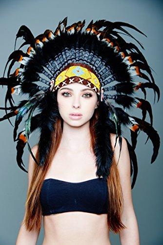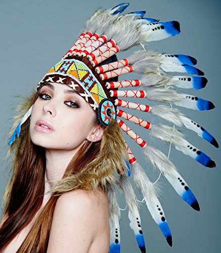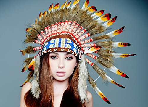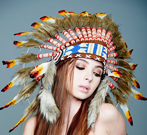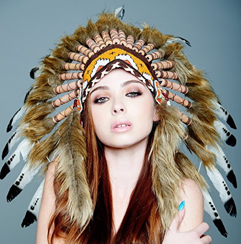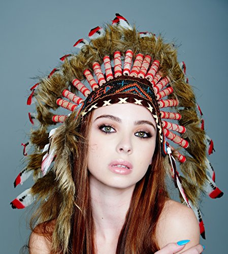 -. Brand : Kayso International Inc -. Feature : Hand Made in Indonesia By Balinese Artisans / Exquisite Native American Unisex adult Headdress is made by hand to an exceptional quality and weighs in at nearly 1 lb / Beads are threaded by hand into a forehand band and long faux fur tails are added before application to the completed headdress / The headdress is created around a real leather skull cap, one size fits most, so there is structure and breathability and long feathers plume from behind / Scrolls are hand-rolled and adorned with 3 real feathers and faux leather before application to the headdress -. MPN : SH010 -. PackageQuantity : 1 -. PartNumber : SH010 -. ProductGroup : Apparel -. ProductTypeName : CHILDRENS_COSTUME -. Size : One Size -. Title : Native American Indian Headdress Feathers Head Piece Warbonnet Short (Many Styles)