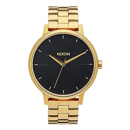 Studio : Nixon Inc. Publisher : Nixon Inc. Binding : Watch Product Description Nixon - Kensington - All Gold / Black Sunray watch - The cool thing about sporting some of grandpa's hand-me-downs is you'll get that perfectly relaxed tomboy look with the authenticity factor of having avoided mall store ubiquity. Classic, but never stuffy, the Kensington is an update on those heirloom styles. And, with Japanese quartz movement and new 38mm custom ceramic case and band, you may just have something of your own worth passing down. Movement: Miyota Japanese quartz 3 hand. Dial: This dial includes engraved and printed indices and custom molded hands. Case: 37 mm, 50 meter/ 5ATM solid stainless steel case with a hardened mineral crystal, stainless steel snap fit caseback and spring pin lugs. Also available with Swarovski crystals and an MOP dial. Band: 16 mm custom solid stainless steel bracelet with a stainless steel locking clasp. Also available with Swarovski crystals. 0