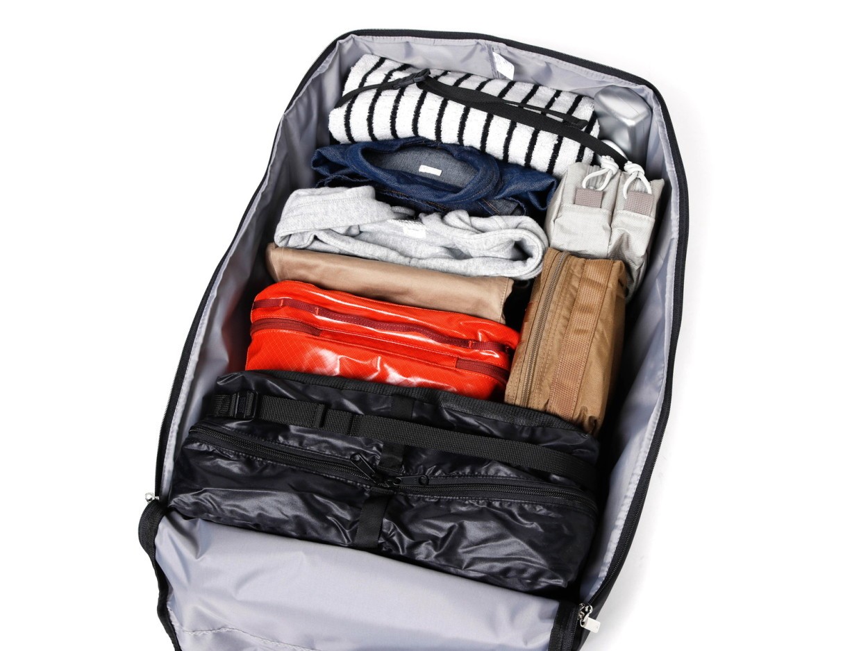 メイン収納部はラウンドジップで大きく開閉します。3~5泊程度の荷物の収納に適しており、収納部に設けられたベルトで荷物を固定することができます。フラップ部分には細かなアイテムの収納に便利なポケットを装備しています。