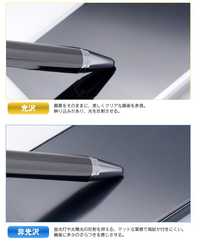| 仕様 | ・キズやホコリをしっかりガードする、保護フィルムです。 ・クリアな画面を実現するグレアタイプと、蛍光灯や太陽光を抑えるアンチグレアタイプの2種類をご用意。 ・汚れや指紋が付きにくい。 ・タッチペンの使用可能です。 |