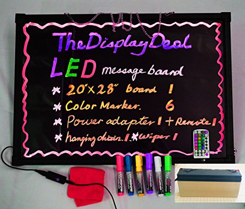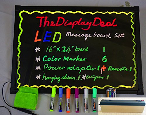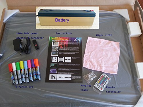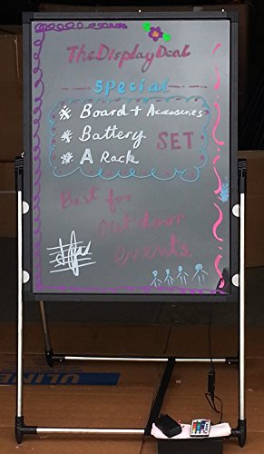 Flashing Illuminated Erasable LED Message Writing Board. 7 Colors of RGB 48 Flashing-Mode, + Remote Control + 8 markers + Metal Chain for Hanging up + Washable Eraser Cloth. Two ways to change flash effects, press USB controller or use the remote to point it directly to the USB connector. Materials: Black aluminum alloy Frame + Tempered glass board surface; Size: 32"W x 24"H x 1/2"D; Tripod stand sold separately. come with one year product warranty. Please contact us seller directly for questions or replacement parts.Feature