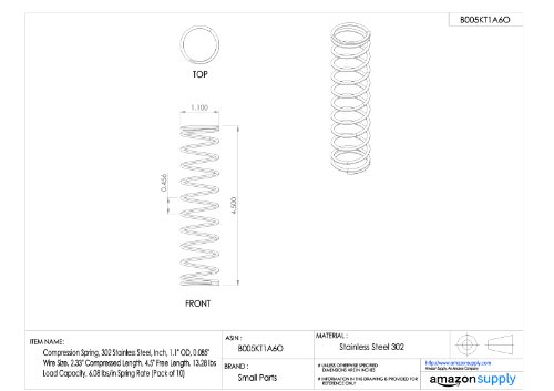 Compression Spring, 302 Stainless Steel, Inch, 1.1" OD, 0.085" Wire Size, 2.58" Compressed Length, 0.5" Free Length, 13.28 lbs Load Capacity, 5.5 lbs/in Spring Rate (Pack of 10)