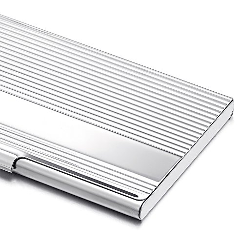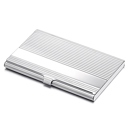 Product Description *Material: Grooved Stainless Steel; Color: Silver Color *Measures: 3.70x2.36x0.30inch *Ideal for business cards, credit cards and ID cards; Holds 10-15 business cards *Slim design, Perfect slips into your front pocket, fits your briefcase, handbag, *Timeless styling perfect for both men and women