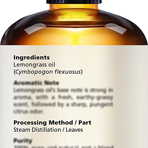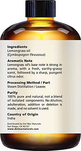 - Del Mar Naturals Lemongrass Essential Oil, pure and natural, therapeutic grade, extracted from leaves by steam distillation, no additives, no dilution, product of India