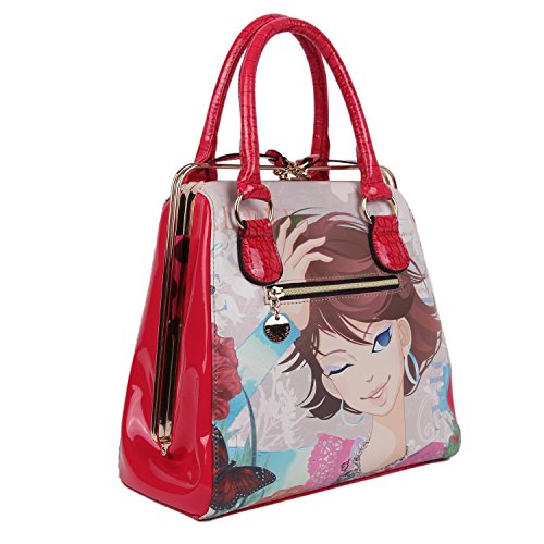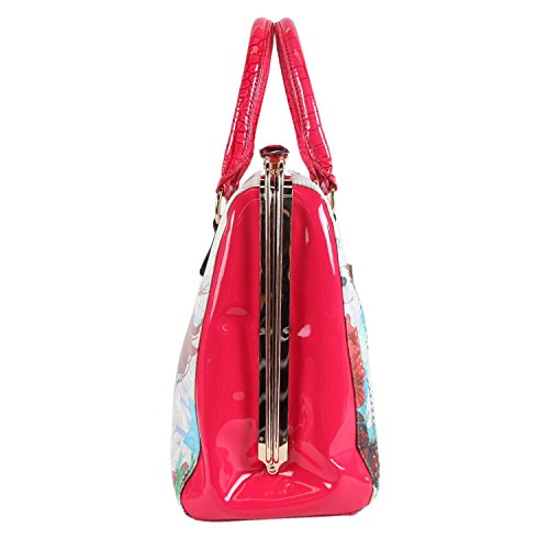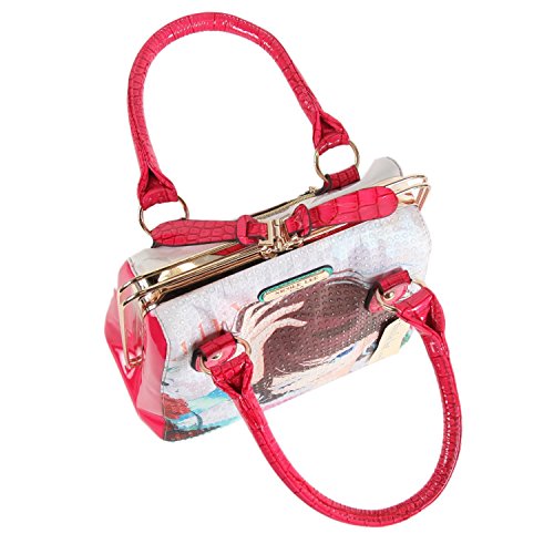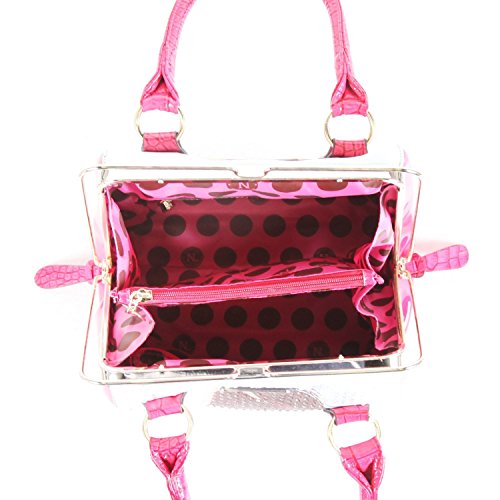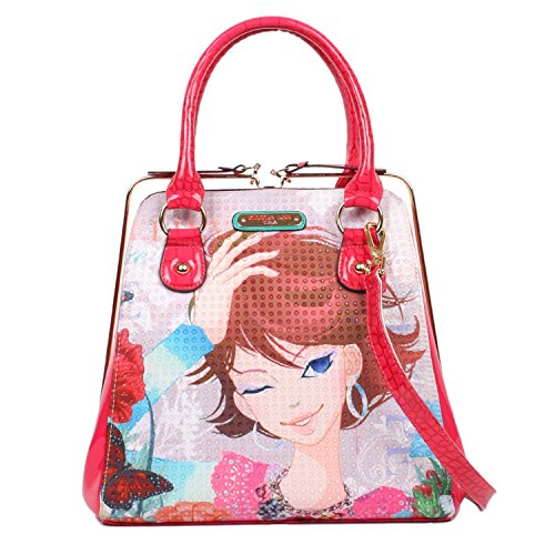 Nicole Lee is known for their unique shapes and prints that brings a story to any bag and this one lives up to the style. A unique style not seen very often, Nicole Lee seems to have found a happy place between being unique and having style. Be fun and flirty with the Nicole Lee Xochil Print Frame Bag. Exterior features: made of faux leather, Nicole Lee Xochil print at front and back, clear rhinestone bedazzled at front, metal sliding zipper closure, faux croc skin trim, flossy faux leather sides, gold-tone hardware, dual faux leather top handles, back zip wall pocket and Nicole Lee signature nameplate at front. Interior features: zip wall pocket with NL nameplate at back, middle zipper pocket divider, 11 slip pockets, dual open wall pockets at front and polka dots print with NL logo satin lining. Faux leather handles with 6 inch drop. Color available is Xochil. For cleaning, wipe with damp cloth.Feature