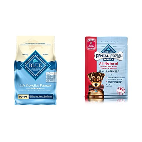 What's in the box: One 6lb bag of BLUE Life Protection Chicken and Brown Rice Dry Puppy Food and one 12oz bag of BLUE Bones Puppy Dental Chew