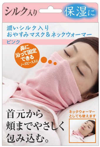 "Moisturizing silk entering good night mask & neck warmer pink" gently wraps from neck to cheeks.