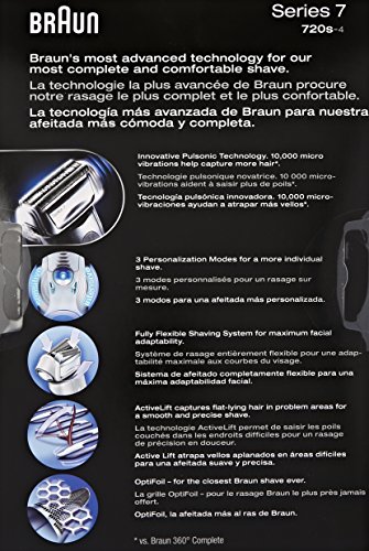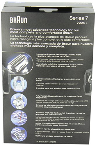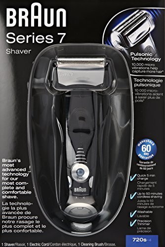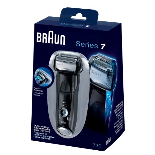 -. Binding : Health and Beauty -. Brand : Braun -. Color : Black -. EAN : 0797978512252 -. Feature : Innovative pulsonic technology. 10,000 micro vibrations help capture more hair -.3 personalization modes for a more individual shave -.Fully flexible shaving system for maximum facial adaptability -.Activelift captures flat-lying hair in problem areas for a smooth and precise shave -.Optifoil - for the closest braun shave ever / Official Electric Shaver of the NFL / OptiFoil - for the closest Braun shave ever / Braun electric shaver with 3 Personalization Modes for a more individual shave, from sensitive to intensive. / Fully Flexible Shaving System for maximum facial adaptability. -. Format : CD-ROM -. IsAdultProduct : 0 -. Label : Braun -. LegalDisclaimer : No returns -. Manufacturer : Braun -. Model : Series 7 -. MPN : Series 7 -. NumberOfItems : 1 -. OperatingSystem : N/A -. PackageQuantity : 1 -. PartNumber : Series 7 -. ProductGroup : Beauty -. ProductTypeName : BEAUTY -. Publisher : Braun -. ReleaseDate : 2010-11-09 -. Studio : Braun -. Title : Braun Series 7-720 Men's Shaver 1 Count -. UPC : 794628292267 -. Warranty : Two-year limited warranty.