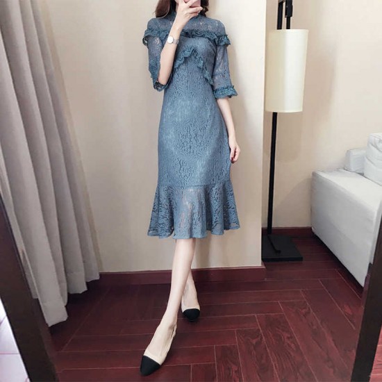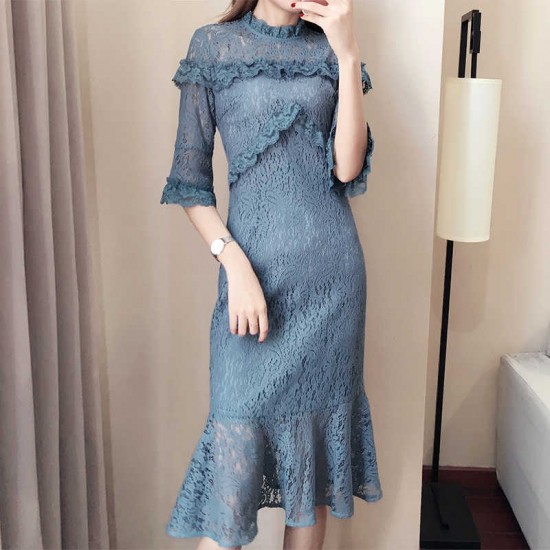 パーティードレス ひざ丈 ワンピース レース フリル 七分袖 セミタイト ブルー マーメイドシルエット 大人 上品 ハイネック お呼ばれ デート drgz2165