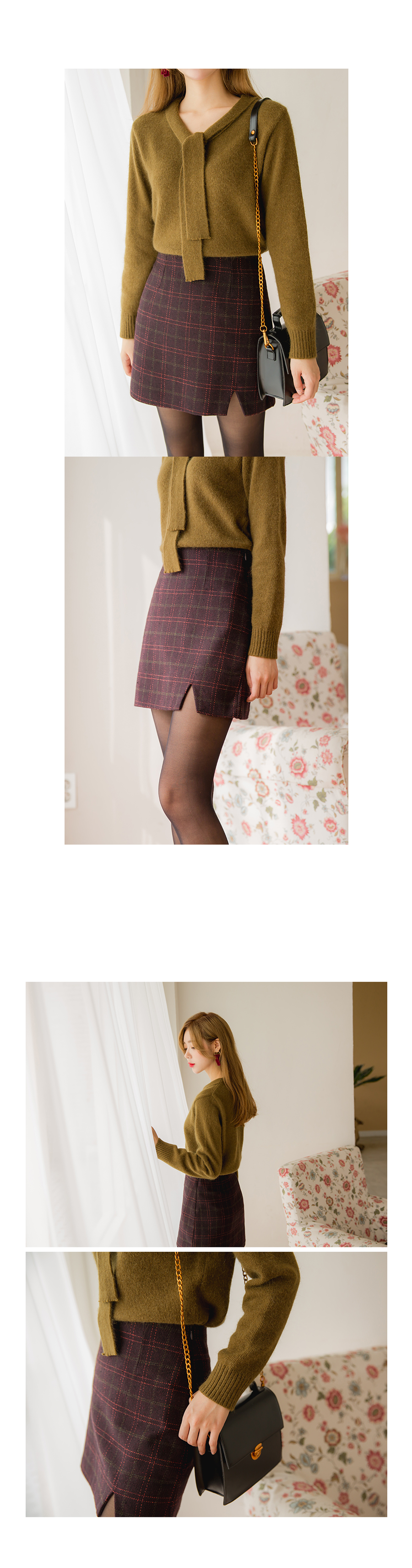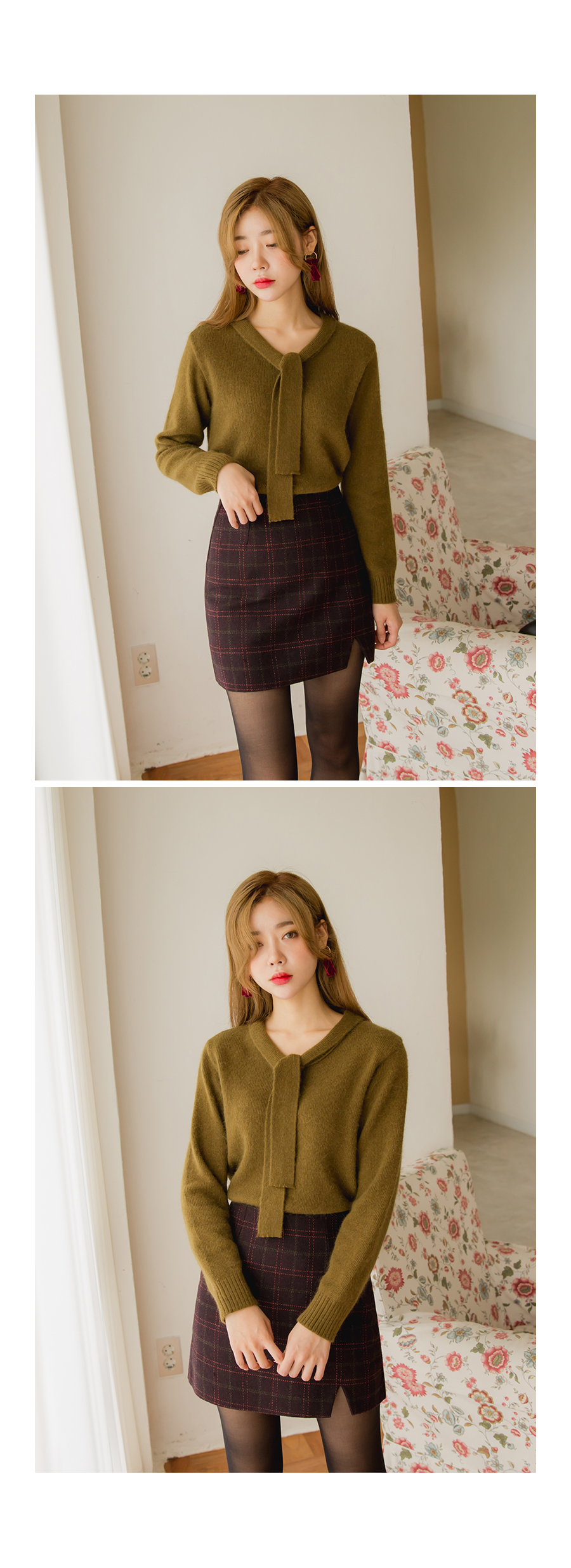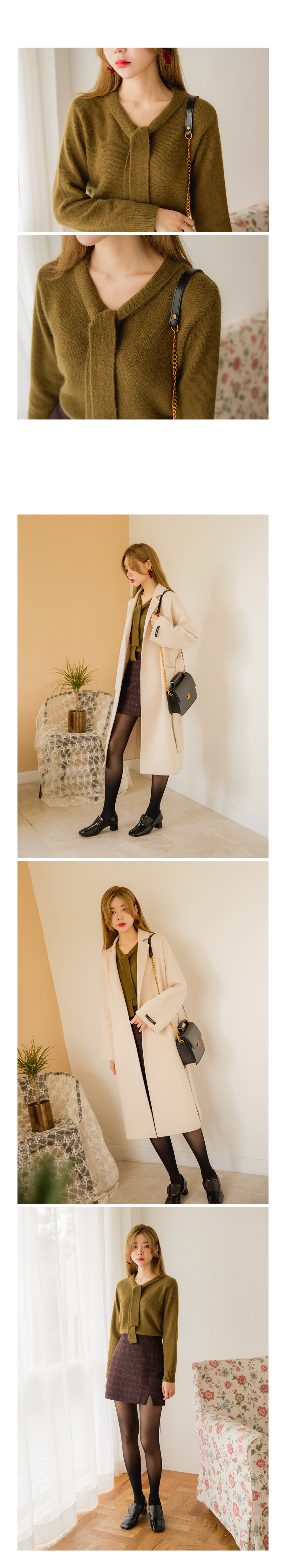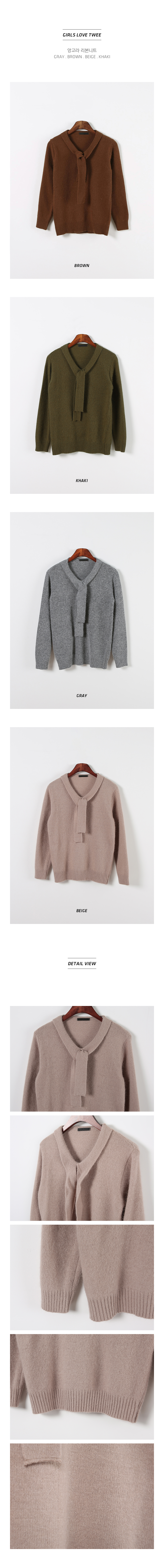 깔끔한 기본핏감 니트에 리본타이 디테일이 부착되어있어