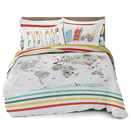Full/Queen World Map Reversible Duvet Cover Set with 2 Pillowcases for Kid Bedding by Where The Polka Dots Roam (L 90in x W 92in)