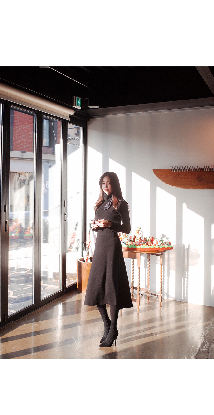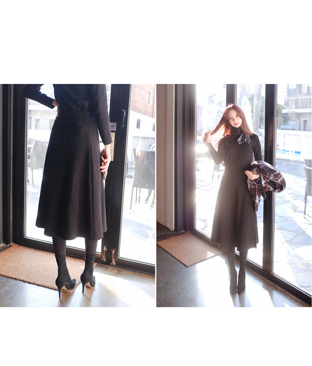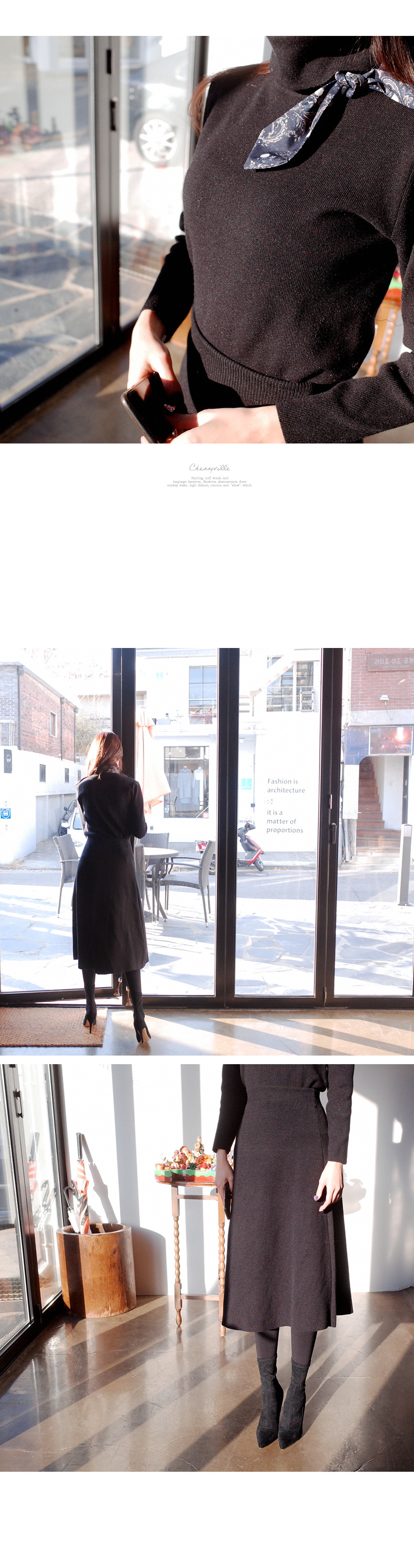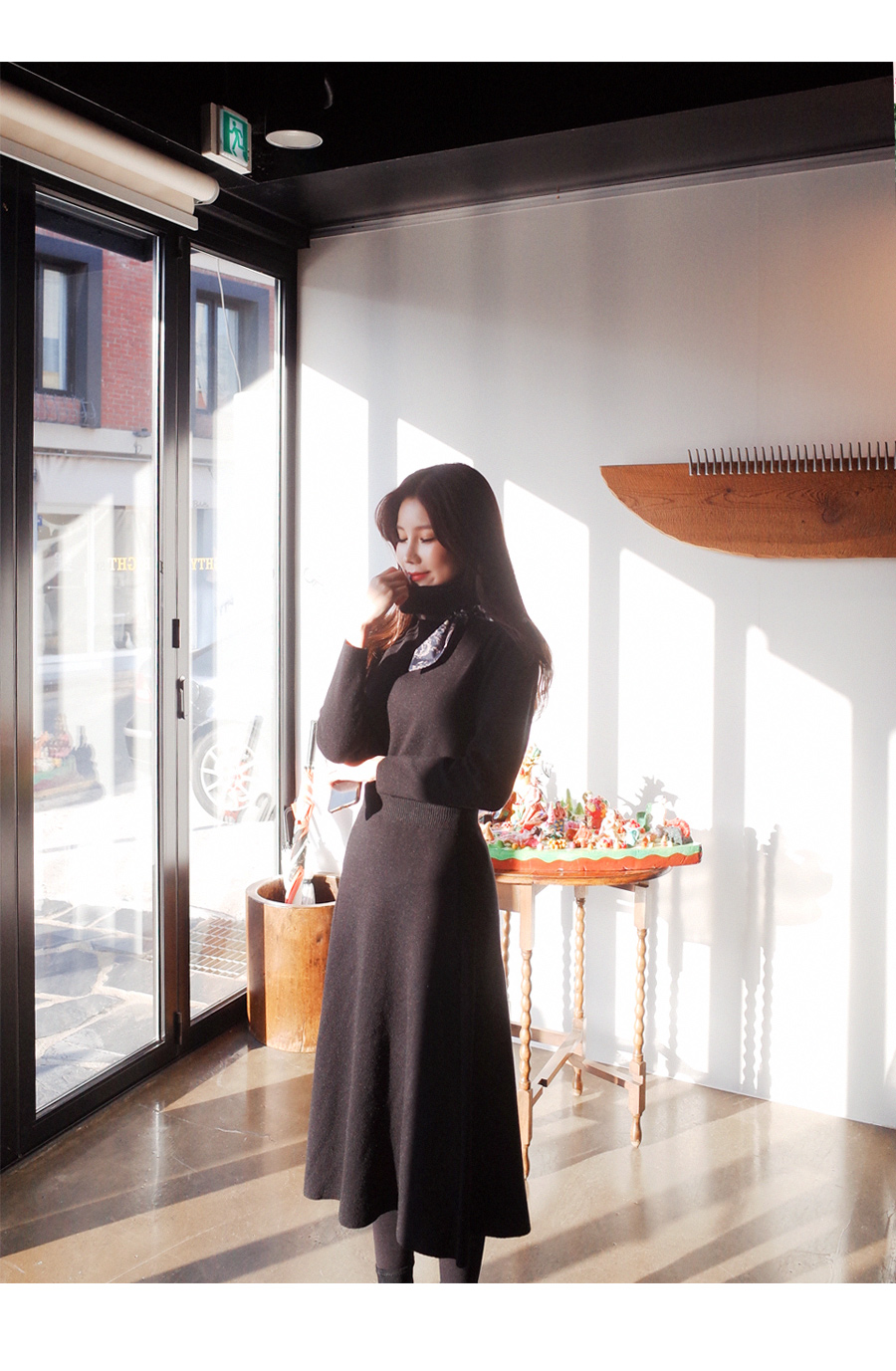 니트는 하이넥스타일이며 스커트는 플레어라인으로