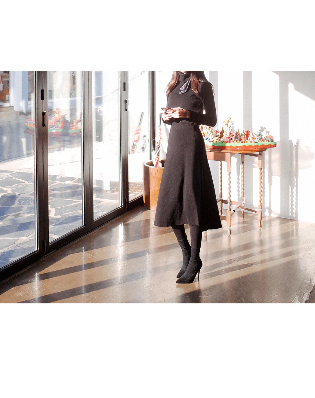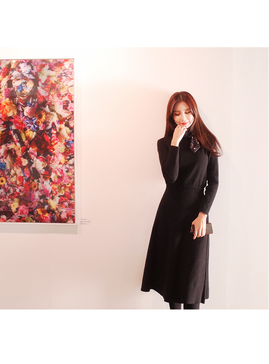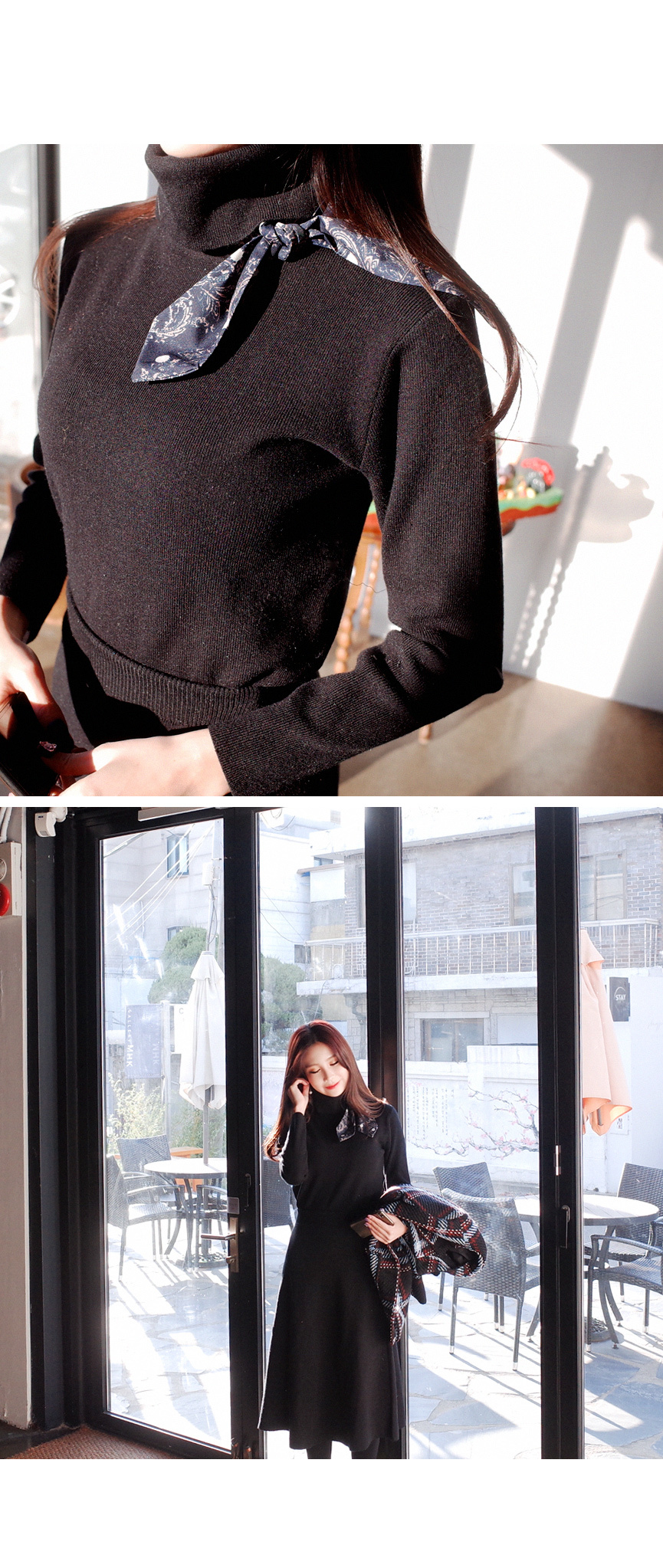 니트는 하이넥스타일이며 스커트는 플레어라인으로