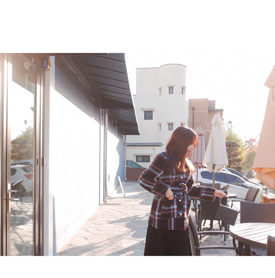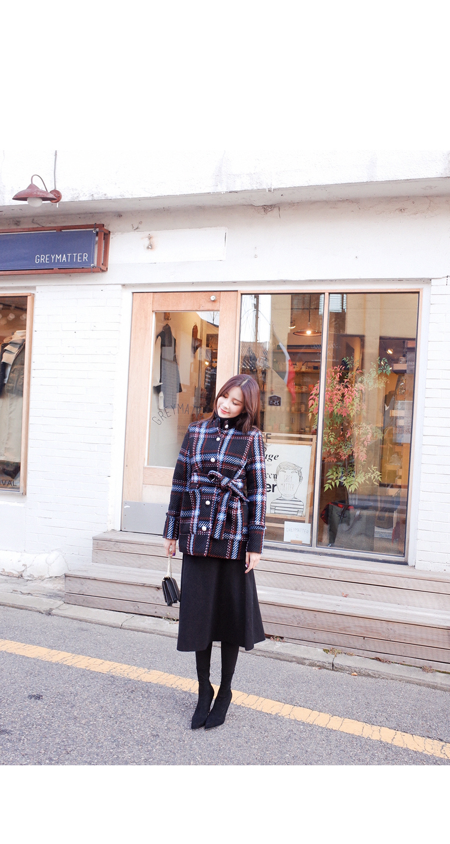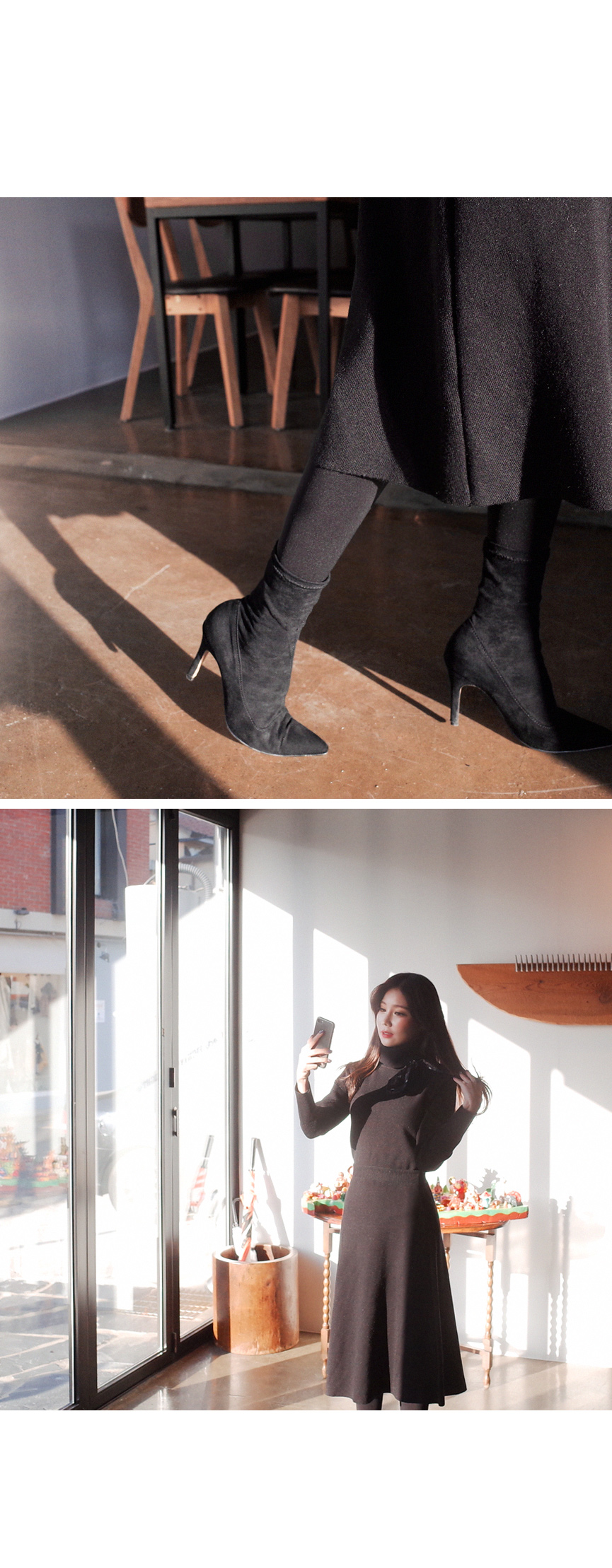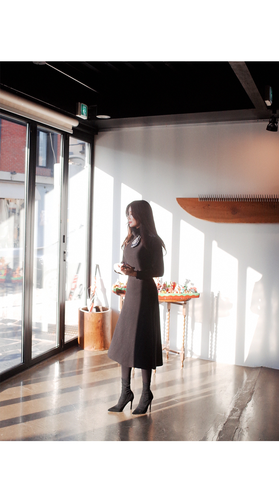 니트는 하이넥스타일이며 스커트는 플레어라인으로
