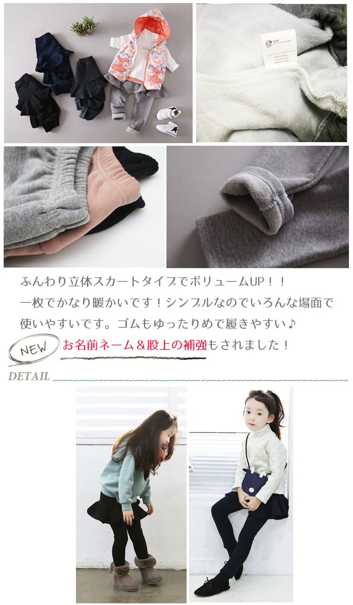 レインコート レインブーツ 靴 靴下 リュック バッグ 洋服 帽子など取り扱い色々子供服 スカッツ 裏シャギー 防寒 スカート付きレギンス 裏起毛 女の子 キッズ セール 送料無料 韓国子供服 スカッツ 6千円以上送料無料人気の裏シャギースカッツ!!ボリュームたっぷりでこれから真冬にかけての必須アイテム!!シンプルデザインでどんなコーデにも使いまわせちゃう♪★韓国子供服について日本国内サイズより少し細身となっております。普段の着用サイズより1-2サイズ上を購入する事をおススメしております。またサイズ実寸につきましても、商品入荷時期によりサイズの大きさに若干の違いがある場合がございます。予めご了承下さい。素材:綿80%、ポリエステル20%