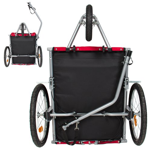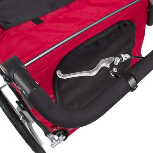 Feature : Lightweight ,Sturdy steel frame with water-resistance polyester, supporting up to 66 lbs / 2-in-1 bug-screen and weather-resistance canopy to keep your pet protected from sun and rain / Lock your pet trailer with a hand-lock brake system when it is not in motion / Safety flag for pet trailer visibility in traffic / Fold up for easy transport and storage in the trunks and storage areas of most vehicles