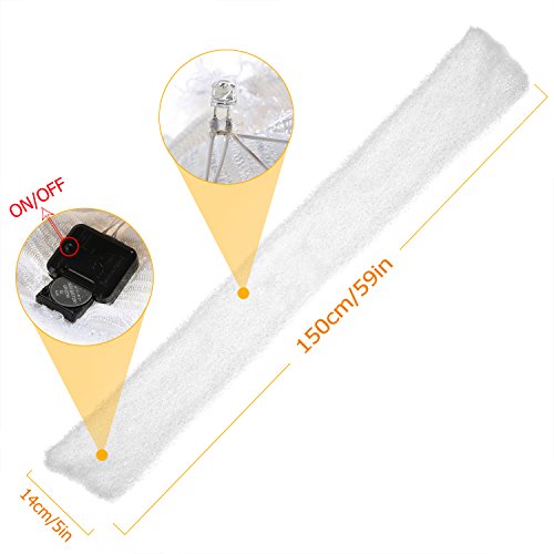 Specifications: Material: Chrysanthemum velvet Size: 59X5(inch)/150X14(cm)(Please check the size information before your purchase) Color: White Function: 12 LEDS 6 Flashing Modes: 3 colors strobe; 3 colors morphing; 3 colors steady;red strobe, green strobe, blue Strobe.(modes can be changed by pressing the switch button). Battery Working Time: about 8 hours(3 color trailing).