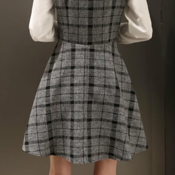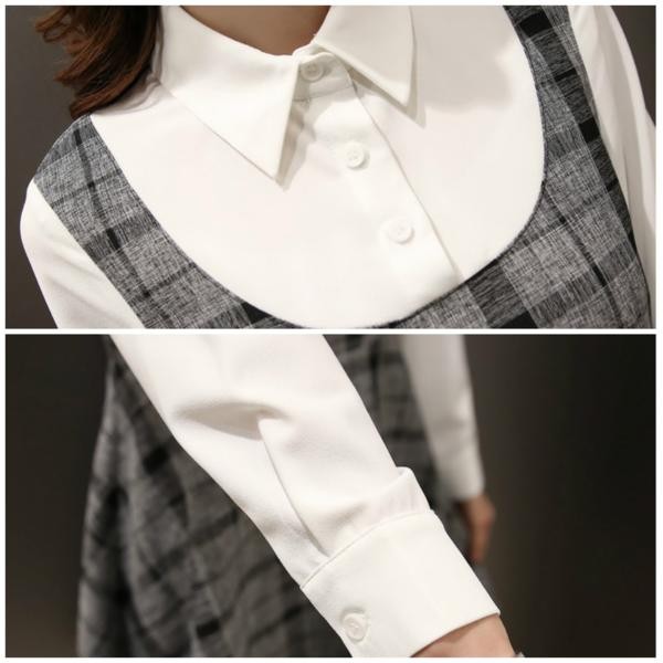 レトロなスタイル長袖ブラウス&チェック柄Aラインジャンパースカート ドッキングワンピース/ L