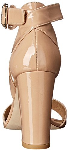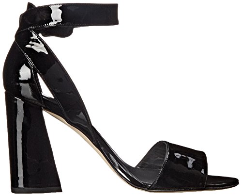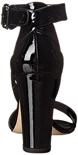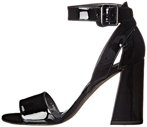 Patent-leather dress sandal featuring wide toe strap and covered heel counter with buckled ankle strap