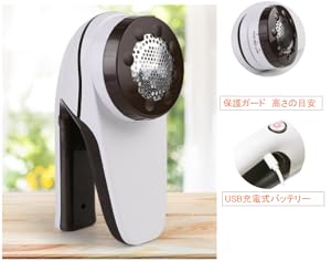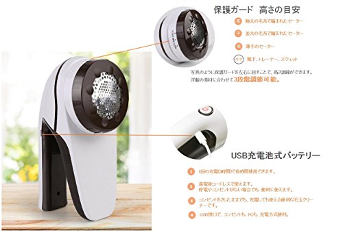 ふわふわガード生地の風合いを守る為、毛足の長さに合わせて高・中・低の3段階切替。保護ガードを左右に回すことで、ガードの高さを調節ができます。 | USB充電池式バッテリーだから、コンセントをさしたままでも、充電しても使える便利な毛玉クリーナーです。1回の充電(3時間)で60~120時間で使用できます。コンパクト設計で旅行や出張にも持ち運べます。いつでもどこでも利用できます。 | 3枚刃の旧モデルからこだわって、切れ味の鋭いステンレス製の6枚大型カッターとハイパワーモーターを搭載。大きな衣類や布製品についている毛玉、糸くずが素早く簡単に除去、じゅうたんやカーテンなどといった手強い極太繊維の毛玉も確実に切り取ります。【替刃を1枚付き】 |