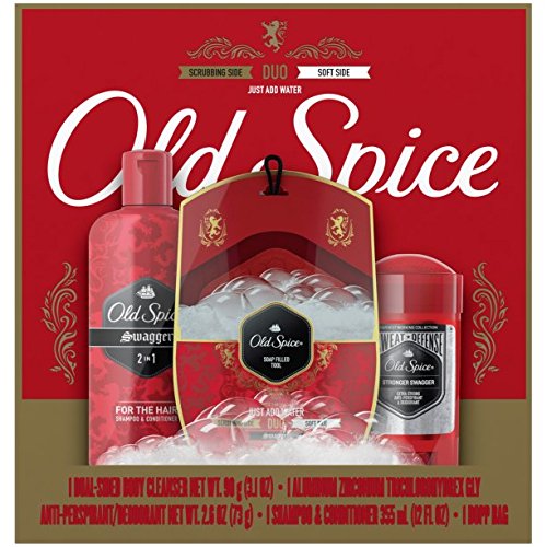 The Old Spice Swagger Gift Pack contains the following: Old Spice Swagger Duo Dual-Sided Body Cleanser, Old Spice Antiperspirant & Deodorant Hardest Working Collection Sweat Defense Stronger Swagger, and Old Spice Swagger 2 in 1 Men's Shampoo and Conditioner