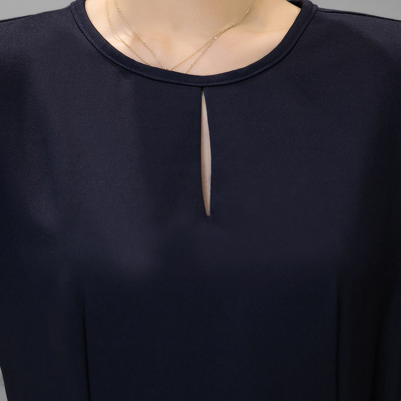 重ね着レイヤード風のラウンドネックシフォンワンピース。