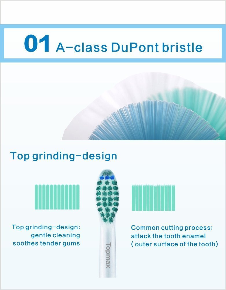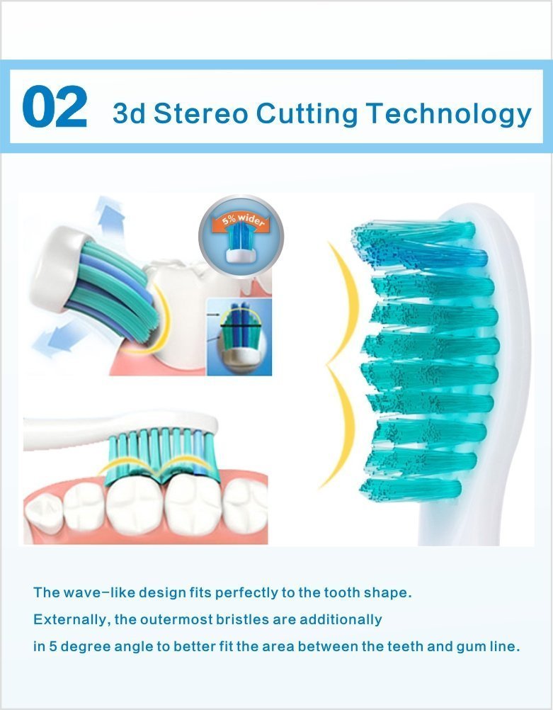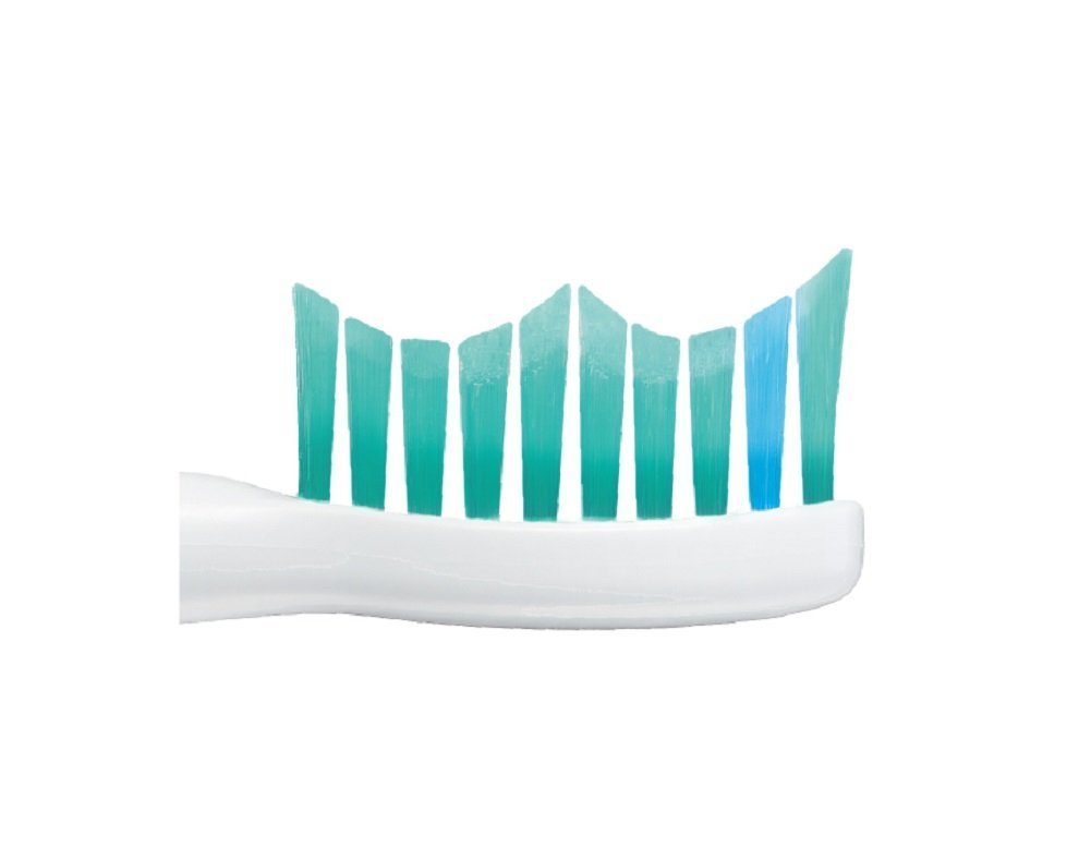 The outermost bristles are tilted 5 degrees and fit in the area between the teeth and gums.