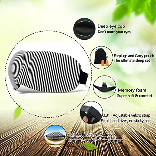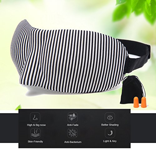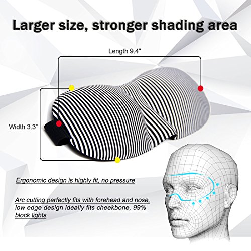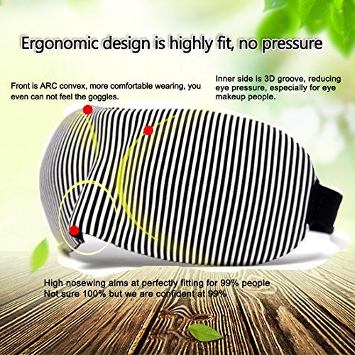 - Contoured Ergonomic Design - Blocks Out 99% Lights - 0% Pressure On Your Eyes - Excellent for Travel - Ideal for Shift-workers - Nap any time of the day - Perfect for Meditation Yoga Relaxation - Protect the skin around your eyes from damage - 3.3" Adjustable Velcro Straps - Bonus Free Ear Plugs and Carry Pouch