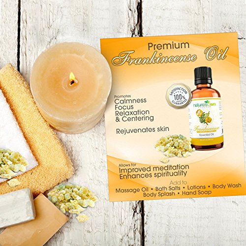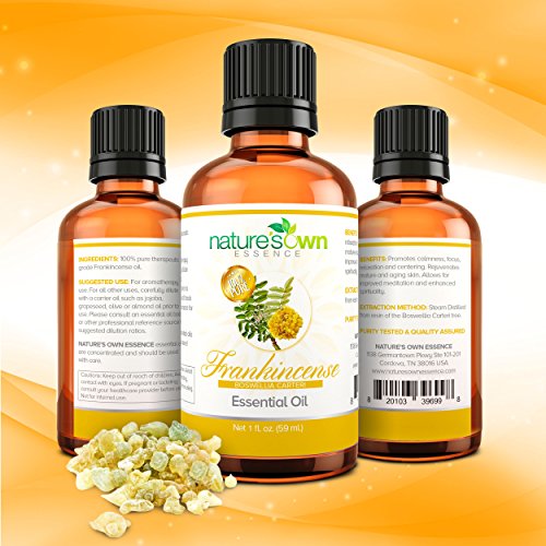 Live WITHOUT Chemicals, Side Effects, Recurring Aches, Pains and Expenses Costing You Your Life. THE 5000 YR OLD Ancient Healing Remedy >> ONE (1) 2oz BOTTLE OF PREMIUM FRANKINCENSE ESSENTIAL OIL - Pure natural undiluted therapeutic grade Frankincense oil from resin of the Boswellia Carterii trees (sourced from the Middle East, the Mecca of Frankincense) >> IDEAL FOR EVERY ASPECT OF SKIN CARE - skin/face blemishes, sores, itching, psoriasis, red spots, acne, scar reduction, excessive dryness, persistent spots. Extremely beneficial as a treatment for dry skin or to combat wrinkles. Can be mixed with lotions, creams and soaps or direct application >> RID YOURSELF OF ACHES AND NAGGING PAINS - Alleviate anxiety and stress, nervous tension and relieve nagging pains without dangerous procedures or chemicals. Incense and diffusers are a popular choice >> PEACE AND CALM FOR YOUR BODY AND MIND - Peace and balance from the moment you wake up to the moment you put your head down. Sooth your mind and emotions, increase your inner peace and mental clarity and potentially awaken your higher consciousness >> BOOST YOUR IMMUNE SYSTEM - Frankincense stimulates the hypothalamus, thyroid, and pituitary glands, all of which work in sync to support a healthy immune system -- so less colds and flu for you >> BEWARE OF CHEAP IMITATORS - We DO NOT dilute our formula AND our pesticide-free organic farming adheres to strict quality standards. Every single batch is tested to guarantee best consistency of smell and properties. Compare to other pure organic oils, Do Terra, Young Living and Plant Therapy >> SEE AND FEEL THE RESULTS OR WE'LL REFUND YOU - We stand behind our oils because they work. If you don't get the results you want with our proven Frankincense oil, we'll give you a full refund, no questions asked. Our #1 priority is to make sure you are happy so you've got nothing to lose except the aches and pains. Click the ADD TO CART button now.Feature