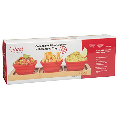 Collapsible Party Dip Bowls w Bamboo Tray - Silicone Snack and Appetizer Bowls w Serving Platter