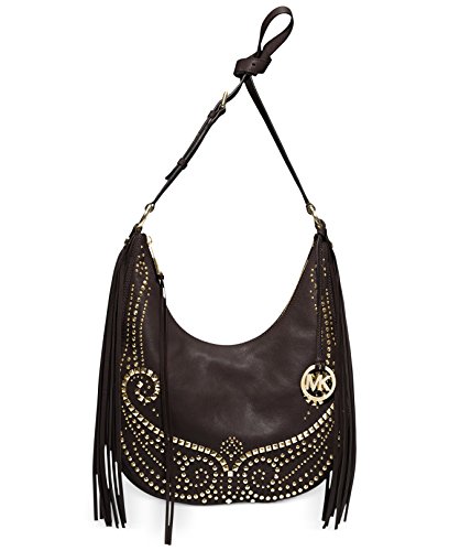 -. Brand : Michael Kors -. Color : Dark Chocolate -. Department : womens -. EAN : 0888235576756 -. Feature : Genuine Lamb leather / Adjustable shoulder strap with 22"-27" drop; Top zip closure / Exterior features gold-tone hardware, heavy stud detail and removable hang tag / Interior features 1 zip pocket, 2 open pockets, 1 cell phone pocket and key fob / Measures 14" W x 7-1/2" H x 2-1/2"D; Includes dust bag -. Model : 30F4GRAL6L -. PackageQuantity : 1 -. ProductGroup : Shoes -. ProductTypeName : HANDBAG -. Title : Michael Kors Rhea Garbour Goat Studded Medium Slouchy Shoulder, Color Dark Chocolate -. UPC : 888235576756