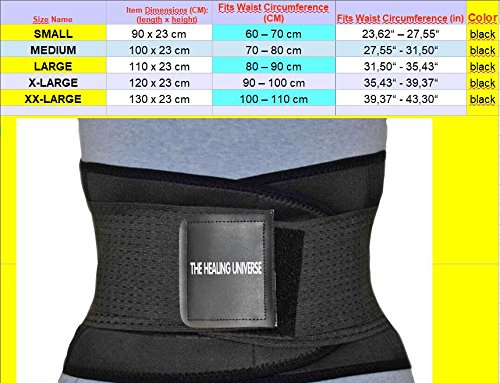 -. Feature : YOUR BEST CHOICE Our Lumbar Support Waist Band for Women and Men stabilizes your lower back and abdominal muscles; Not only it supports your lower spine and relieves lumbar back pain, but also it helps to burn belly fat, drains tissue water and reduces your waist circumference from the very first moment of use; If you are looking for an effective way to lose weight, and slim your waist this Body Wrap For Working Out and Spine Support made by The Healing Universe surely is your best choice today / FEATURES Certainly more than the flat stomach or six-pack abs, you aim at a strong core that provides a better balance, easier breathing, improved blood circulation and a healthy posture; Our double laced Lumbar Support Belt offers your lower back spine the important strength and aid to avoid lumbar spine pain and or recover from spine injuries; wearable all days during your work or your physical activities like exercises and workout, unloading, golfing, riding, heavy lifting / FEATURES Functions as Stomach Fat Burner Belt for men and Belly Burner Weight Loss Belt women; If you wear our Stomach Fat Burner Wrap during your exercises just like an all rubber sweat belt you can reduce belly fat faster; In addition to the support of the spine and the pain management it functions as water loss belt, abdominal belt weight loss and EMS Belt for ABS; these are the main reasons for customers to choose our lumbar belt; / HIGH QUALITY The Healing Universe waist trainer and back support is made of high-quality strong and highly stretchable double-laced NEOPRENE with elastic straps and velcro; Not only is it the ideal fitness equipment for women for weight loss but also is it the best abdomen wrap for men; Known under the term Belly Fat Burner Wrap for women and men this unisex Stomach Shaper has captured the sauna and sports clubs as the best waist trainer short torso; an additional benefit to its healthy function / 100 % SATISFACTION GUARANTEED; Risk Free due to our 30-Days Manufacturer Money Back Guarantee; Concentrated lumbar support; Lower Back Support Belt for women and men prevents from Sports Injuries; relieves Lower Spine Pain; Burns Belly Fat and drains Water; Adjustable DESIGN Waist Trainer Belt with extra stability due to the flexible incorporated plastic components which eliminate the brace from rolling or bunching during workout and movements;