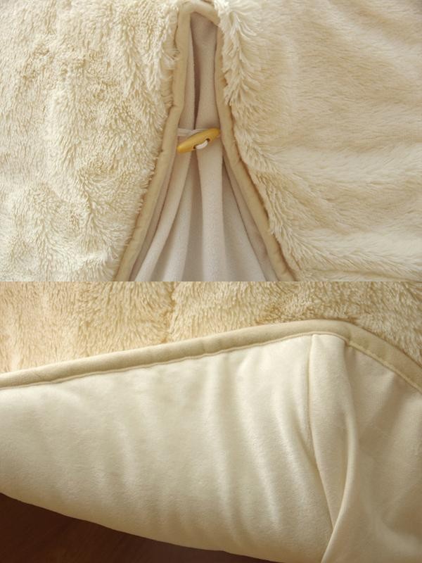 | 素材・材質 | 【表地】ポリエステル100%(長毛フィラメントPH18mm) 【裏地】 天板部:ポリエステル80%、綿20% タレ部:ポリエステル100%(マイクロファイバー) 【中材】ポリエステル100% |