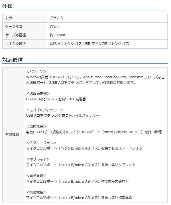 | スマートフォンやタブレット(充電用マイクロUSB端子を持つ機種)と各機種に対応したUSB充電器やモバイルバッテリーなど、またはUSB AコネクタのパソコンとマイクロUSBコネクタを持つスマートフォン・タブレット・USB機器とを接続するケーブルです。パソコンとスマートフォンを接続し、データの同期やファイルの転送を行えます。 |