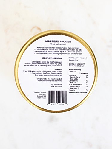 -. Binding : Health and Beauty -. Brand : Live 24k -. Feature : Versatile Golden Milk Powder Blend / Organic Turmeric + Grass-fed Collagen Based / No Sugars, No Gums / Formulated for optimal turmeric absorption w/black pepper and fats / Anti-inflammatory support -. IsAdultProduct : 0 -. Label : Live 24k -. LegalDisclaimer : Naturally a gluten-free, dairy-free, nut-free product; Our product is manufactured in a facility that does process allergens. While our ingredients generally regarded as safe by the FDA for pregnant and breastfeeding women, you should always consult with your doctor before starting any new food regimens. -. Manufacturer : Live 24k -. ProductGroup : Health and Beauty -. ProductTypeName : HEALTH_PERSONAL_CARE -. Publisher : Live 24k -. Studio : Live 24k -. Title : Golden Fuel: Golden Milk Turmeric + Collagen Blend