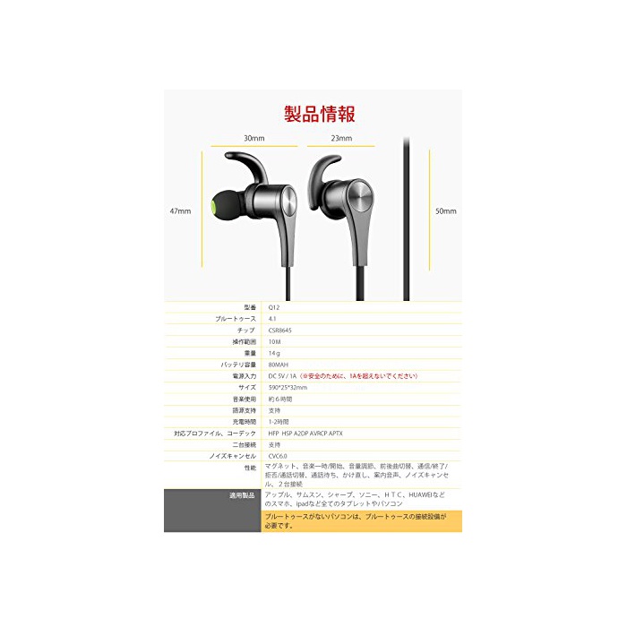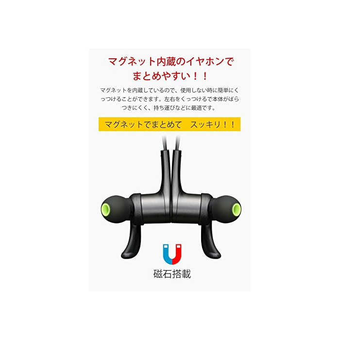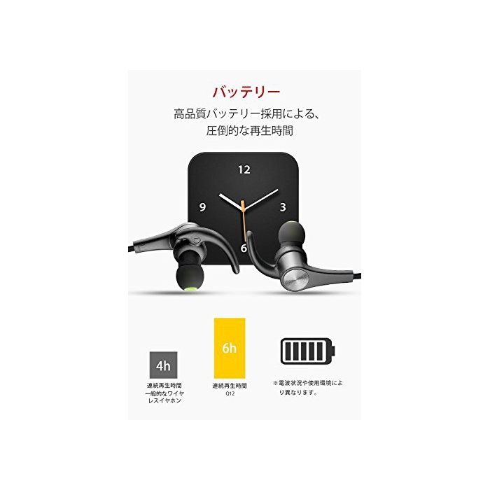 1) 【인간공학에 기초 있던 스포츠 디자인 마그넷 탑재6시간 연속 사용】 Q12의 최대의 특징은 그 디자인입니다.콤팩트에 가볍고, 쾌적하게 장착에 옵니다.귀의 상부로 피트 하는 부드러운 훅을 장착하고 있고, 이어폰을 귀에 제대로 고정에 옵니다.런닝이나(죠깅)Jogging,스케이트 등 운동 시,또한 운전 등 밖에서 일 할 때도 빠지는 일이 없는 모아 두고, 매우 보물(보배)에 옵니다. 【마그넷 탑재】사용 하지 않는 때는수에 돌린 채로 귀부터 제외하고 그대로 마그넷 동지를 붙이면 목걸이 모양이 되어 낙하 방지로 이어집니다. 【대용량 배터리】1회 약2시간의 충전으로 약6시간의 연속 사용(통화 음악 재생)와 180시간의 대기 이 생깁니다(도쿄 오사카간을 왕복 가능)때문에,통근 통학이 가게 되어 등 시에도 안심하고 사용 하실 수 있습니다.또한접속했 iOS디바이스(iPhone,iPad,iPod등Apple사의 제품)에는 배터리잔량도 표시에 옵니다.